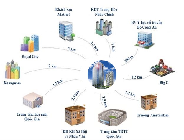 - Từ dự án có thể di chuyển dễ dàng tới các trung tâm phát triển của Hà Nội như: Trung tâm hội nghị Quốc gia, Siêu thị Big C, Tổ hợp thể thao Mỹ Đình, Trung tâm thương mại Grand Plaza…
