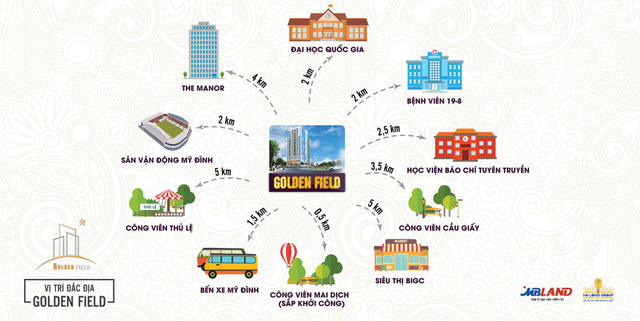 - Dự án Golden Field Mỹ Đình được thừa hưởng những tinh hoa của khu đô thị mới Mỹ Đình khi nằm cạnh những toà nhà cao tầng, các trung tâm thương mại hạng sang, giữa các trường học và bệnh viện uy tín.