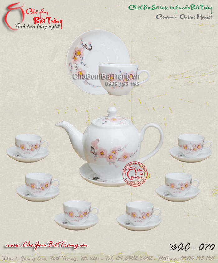Bộ ấm chén men trắng CK cao vẽ hoa đào