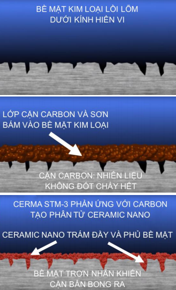 Chất Xử lý Cerma tác dụng với Carbon từ nhiên liệu không đốt hết, tạo phân tử Ceramic Nano cực nhỏ.