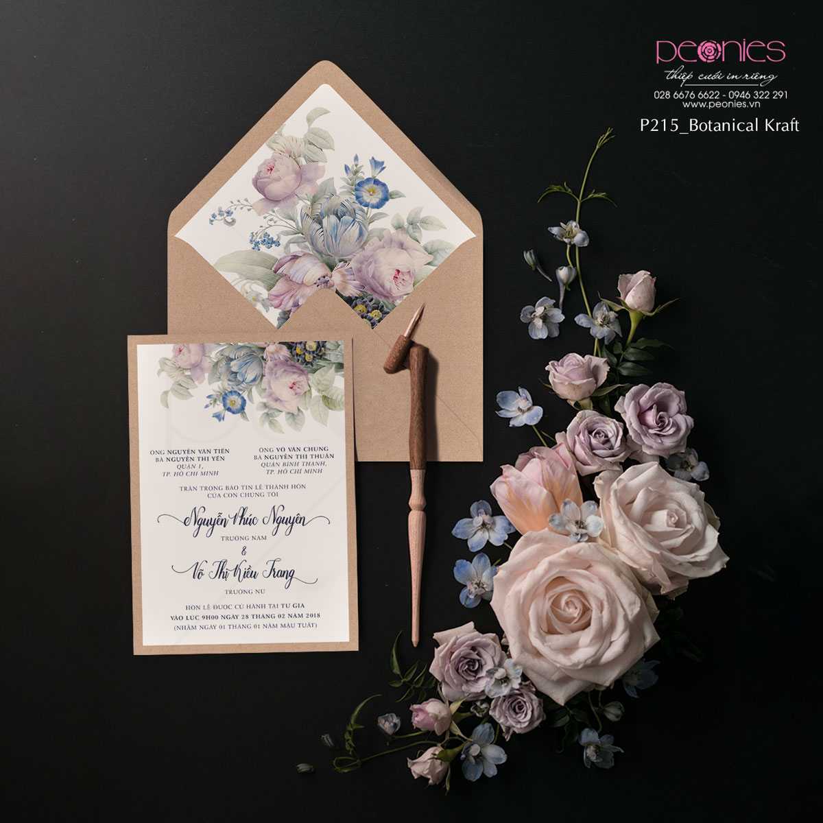 – Thiệp báo hỷ in 1 mặt + thiệp mời in 2 mặt + bao thư in 2 mặt, bạn có thể điều chỉnh loại giấy, kiểu in, phụ kiện (nếu có) theo tư vấn của Peonies.