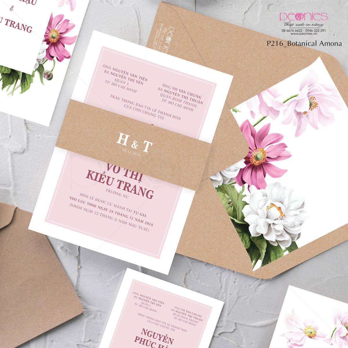 – Thiệp báo hỷ in 1 mặt + thiệp mời in 2 mặt + bao thư in 2 mặt, bạn có thể điều chỉnh loại giấy, kiểu in, phụ kiện (nếu có) theo tư vấn của Peonies.